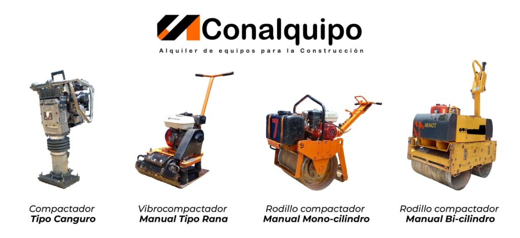 - Compactadores mono-cilindro: ideales para compactar suelos medianos; nivelando y apisonando uniformemente los espacios y vacíos entre las partículas del suelo y de fácil acceso en áreas pequeñas.